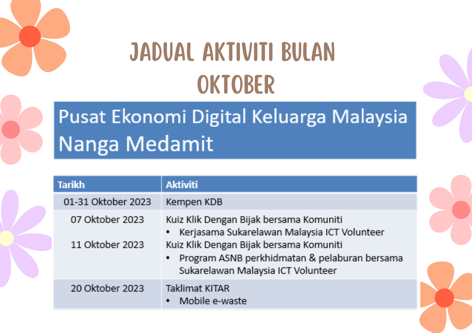 Booth Pameran Klik Dengan Bijak dan KITAR Mobile E-Waste Bersempena Program Fun Run Friendship Bridge 2023 Tarikh : 07-08 Julai 2023 Masa : 8.00am – 05.00pm Lokasi : Dewan Kampung Pahlawan Peserta : 136 Orang Tujuan: Menyampaikan maklumat-maklumat mengenai Klik Dengan Bijak […]