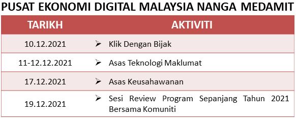E-PEMBELAJARAN (E-TUISYEN) Tarikh : 03,10&17 Oktober 2021Masa : 09:30am – 10:30amTempat : Pusat Internet Komuniti Nanga Medamit
